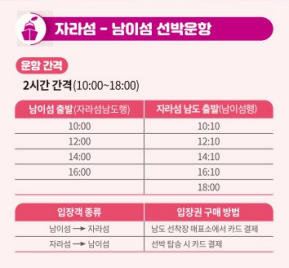 - 셔틀버스 정류장: 가평역 앞, 가평터미널, 자라섬 입구