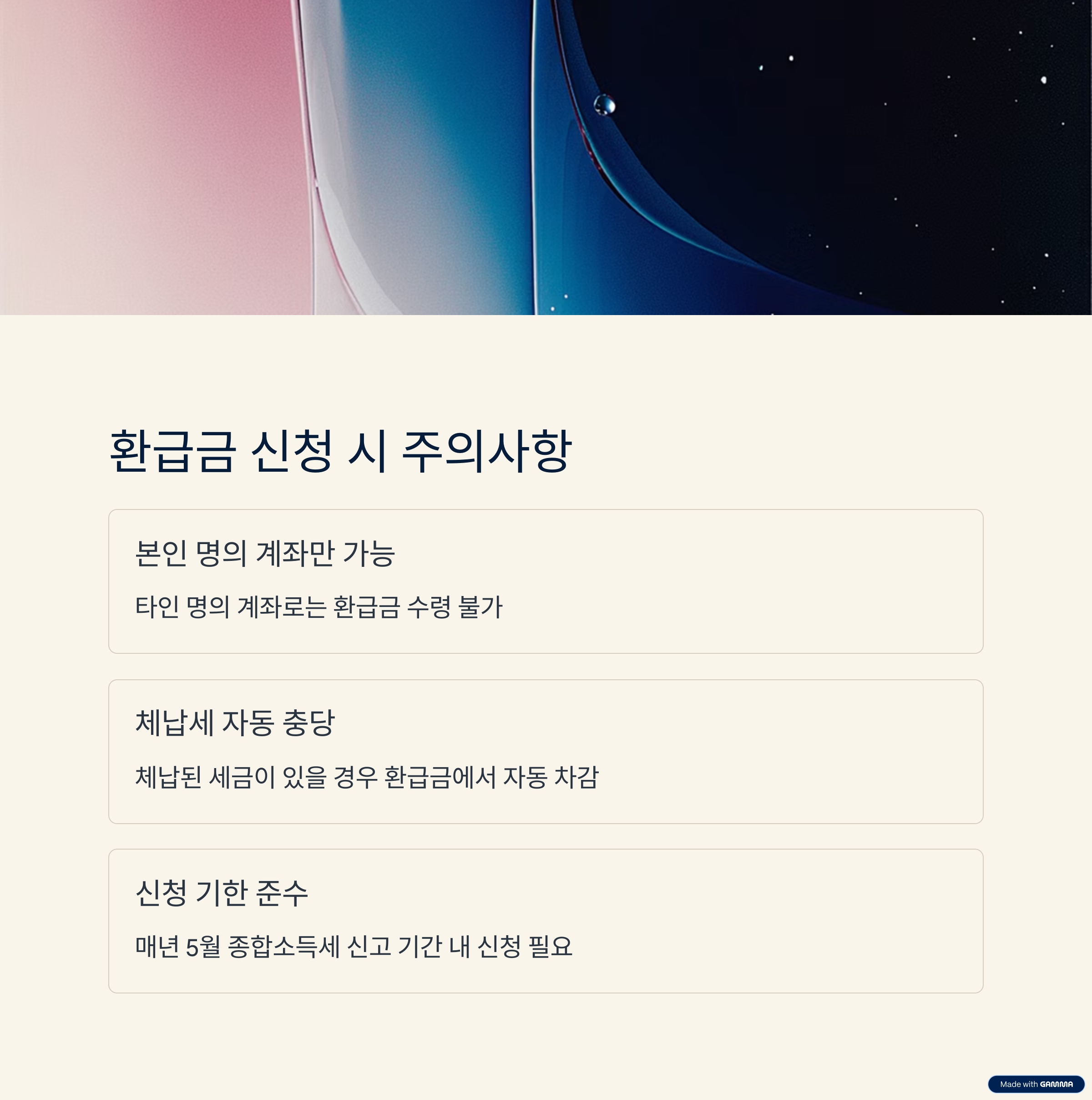 우선, 환급계좌는 반드시 본인 명의의 계좌여야 한다. 타인 명의 계좌로는 환급금을 수령할 수 없으므로, 사전에 본인 명의 계좌를 준비해야 한다.