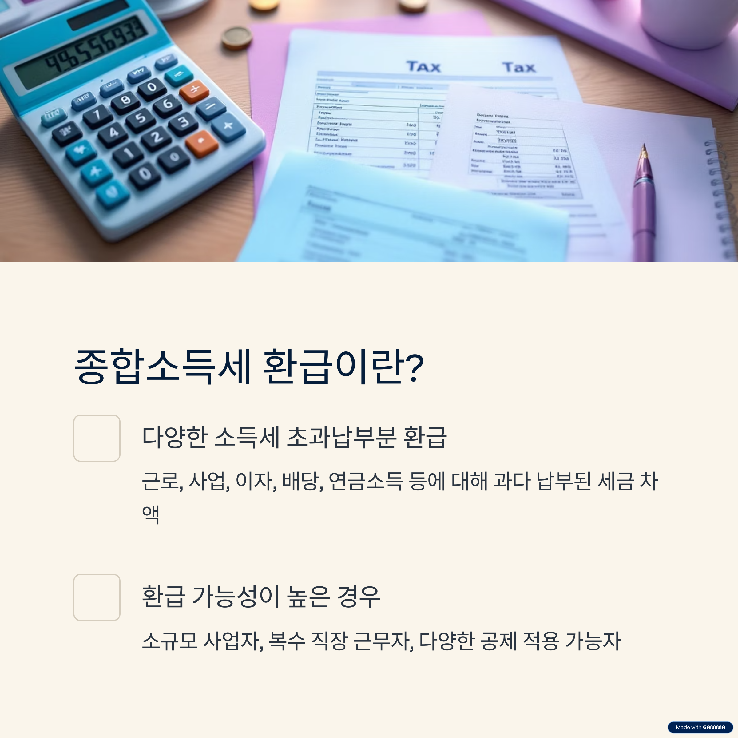 종합소득세 환급은 근로소득, 사업소득, 이자소득, 배당소득, 연금소득 등 다양한 소득에 대해 납부한 세금이 실제 납부해야 할 금액보다 많을 경우 그 차액을 돌려받는 제도이다. 특히 연말정산이나 원천징수 과정에서 과다 납부된 금액이 있을 때 환급 대상이 된다.