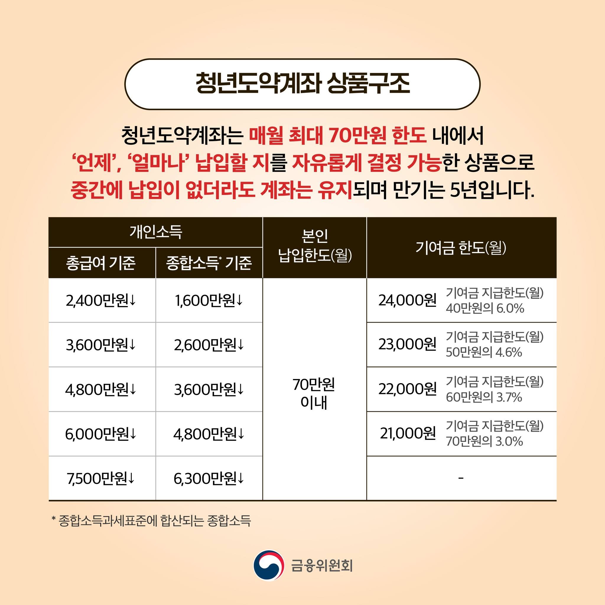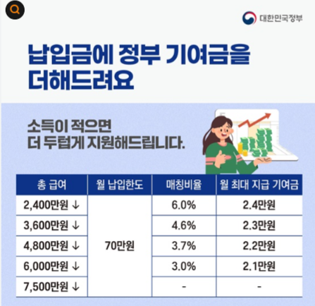| 정부 기여금 | 소득 구간별 월 납입분의 3~6%지원 최대 33,000원 |